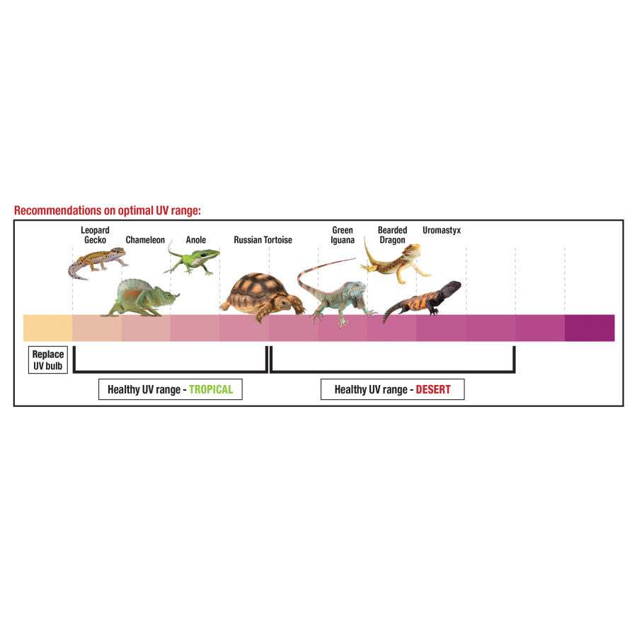 Featured chart shows recommended UV levels to easily verify with the Rapid Sense indicator color to ensure you animal is getting the correct amount of UV for their health